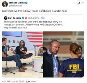 The rumor began circulating on X (formerly Twitter) after a cryptic tribute message posted by conservative commentator Dan Bongino led many users to believe the message was referring to Brand.