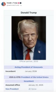 Donald Trump has once again ignited global controversy after sharing a doctored image on Truth Social suggesting he is the “Acting President of Venezuela.” The post, which appeared without explanation, showed what looked like Trump’s Wikipedia profile listing him as assuming office in Venezuela on January 20, 2025, with JD Vance named as his deputy.